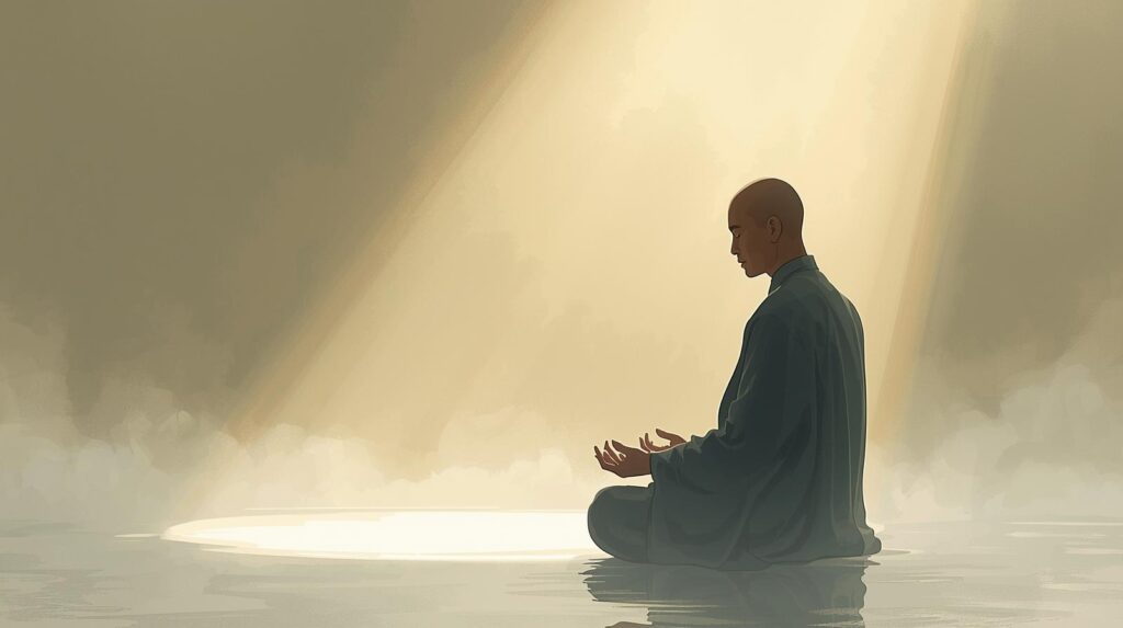 À l’inspiration, imagine que tu prends la souffrance — la tienne ou celle d’autrui — sous forme d’une fumée sombre, d’une lourdeur ou d’une chaleur dense.